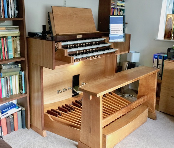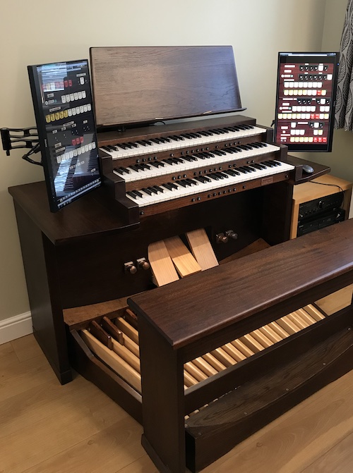 This is a typical example of our Sherwood design. This one is made from cherry veneer and solid red oak. We like contrasting woods. It is fitted with Fatar TP/60 keyboards and a refinished redundant pipe organ pedal board. Twin touchscreens allow easy stop control with multiple sample sets. The computer is concealed inside the case.